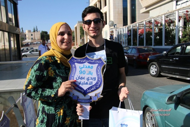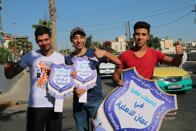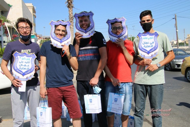 قامت جامعة عمان الاهلية السبت 15-8-2020 'من خلال فريق عمل باشراف السيد عوني متعب العواملة ' بمشاركة طلاب وطالبات الثانوية العامة 'التوجيهي' احتفالاتهم بمناسبة النجاح و قاموا بتوزيع الهدايا و الحلوى عليهم و تسليم الطلبة الناجحين طلبات و منشورات توضح آلية الالتحاق بالجامعة و التخصصات الجامعية التي تناسب كل معدل لمساعدة الطلبة على اختيار التخصص الذي يناسبهم و يلبي طموحاتهم الى جانب توضيح كافة الخدمات والامتيازات التي تقدمها الجامعة لكافه الطلبة.