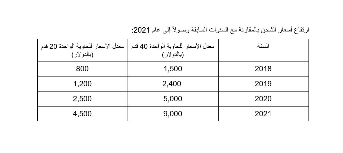 وأكد المنتدى أن الارتفاع الحاصل في أسعار الشحن لغاية تاريخه هي واقعة غير مسبوقة على مدار عقود سابقة، ويأتي هذا الارتفاع جراء ارتفاع وتيرة الطلب بشكل مفاجئ، البروتوكولات الصحية المعتمدة في سلاسل التوريد مثل تعقيم الحاويات وغيرها، الإغلاقات لبعض الموانئ مما أدى إلى تحول الشحن من شحن مباشر إلى غير مباشر وبواسطة نظام الترانزيت.