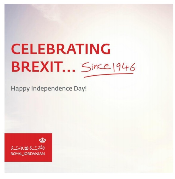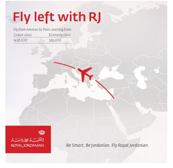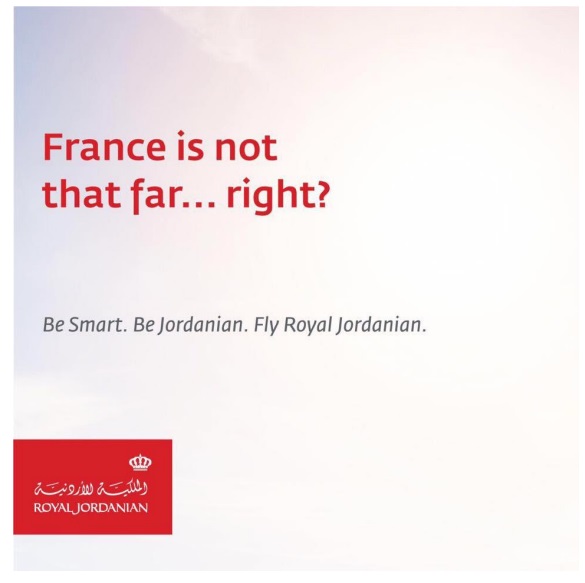 وأشارت الشركة إلى أن القائمين على التسويق للملكية الأردنية أصبحوا يتابعون بشكل حثيث جميع الأحداث العالمية الرئيسية ويستخرجون منها رسائل إعلانية مرحة تبعثُ في النفس البهجة وترسم الإبتسامة على وجوه القراء والمتابعين، مع مخاطبة إحساس الجمهور والمسافرين ودعوتهم لإستخدام طائرات الملكية الأردنية وفي إطار من الحقائق المرتبطة بالملكية الأردنية كناقل وطني عريق.