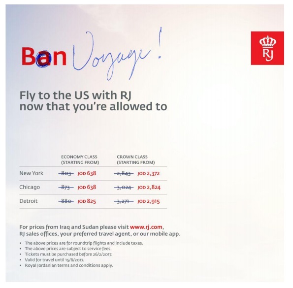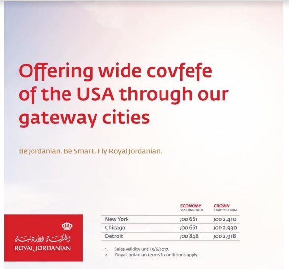 تواصل شركة الخطوط الجوية الملكية الأردنية إطلاق حملاتها التسويقية المتميزة بروح الدعابة والفكاهة على مواقعها للتواصل الإجتماعي منذ أن أطلقت الشركة هذا النوع الجديد من الإعلانات التسويقية لأول مرة في شهر تشرين أول 2016 قبيل الإنتخابات الرئاسية الأمريكية .