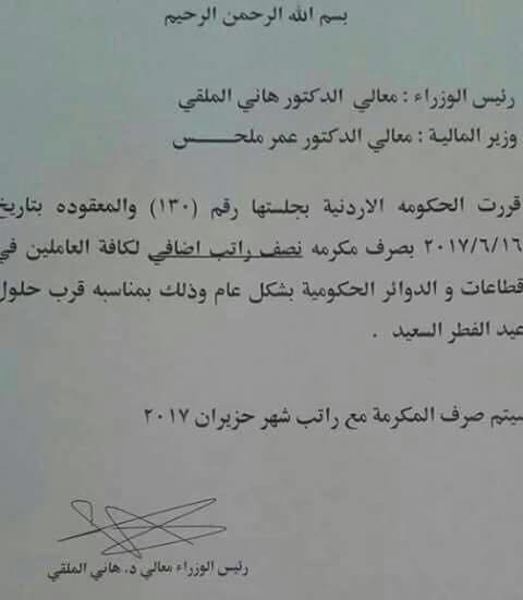نفى مصدر مسؤول صحة الكتاب الذي يجري تداوله عبر مواقع التواصل الاجتماعي والذي يشير إلى قرار حكومي "وهمي" بصرف مكافآت لموظفي القطاع العام قبل عطلة عيد الفطر السعيد.