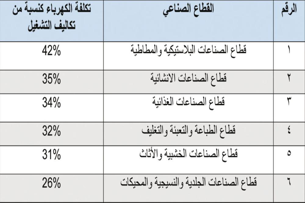 وبينت الدراسة نسبة تكلفة الكهرباء من تكلفة التشغيل لعدد من قطاعات الصناعات التحويلية حسب دراسة اعدتها غرفة صناعة الاردن لتعرفة الكهرباء كنسبة من تكاليف التشغيل حيث بلغت نسبة التعرفة الكهربائية لقطاع الصناعات البلاستيكية والمطاطية 42% وقطاع الصناعات الانشائية 35% وقطاع الصناعات الغذائية 34% وقطاع الطباعة والتعبئة والتغليف 32% وقطاع الصناعات الخشبية والأثاث 31% وقطاع الصناعات الجلدية والنسيجية والمحيكات 26% .