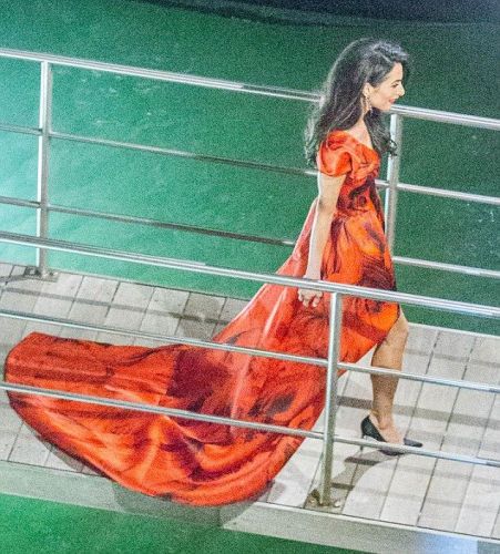 ووصل الزوجان على متن زورق آلى، وارتدت العروس بدلة بيضاء وقبعة بيضاء، كما ارتدى الزوج بدلة رمادية، وقد سبقهما في الوصول عمدة روما السابق وصديق كلوني والتر فيلتروني، الذي قام بإتمام مراسم الزواج المدني .