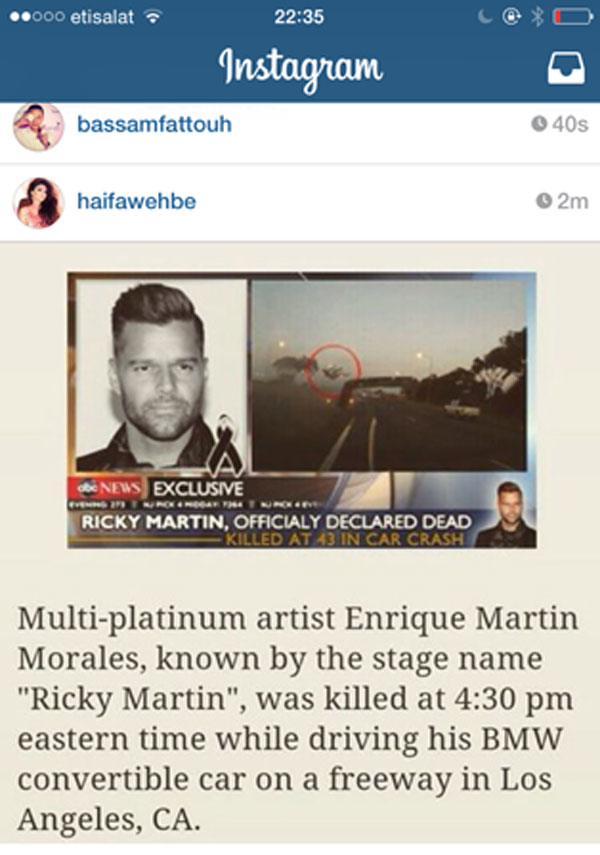 الراي نيوز وقعت النجمة اللبنانية هيفاء وهبي ضحية لشائعة وفاة النجم العالمي ريكي مارتن، حيث تناقلت عدة مواقع إلكترونية عالمية خبر وفاة المغني البورتريكي إثر حادث سيارة، وقامت هيفاء بنشر الخبر دون التحقق من صحته.