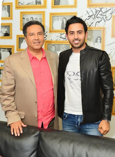 الصورة المرفقة للفنان محمد عبده مع الفنان فؤاد عبد الواحد في الستوديو أثناء تسجيل أغنية "الزفة" في ستوديوهات أغاني في دبي.