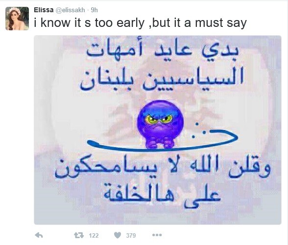 ونشرت صورة أرفقتها بالتعليق التالي: "بدي عايد أمهات السياسيين في بلبنان وقلكن الله يسامحكن على هالخلفة". وقد لاقت الصورة إعجاباً كبيراً من متابعي إليسا الذين أثنوا على طرافتها في تعليقها