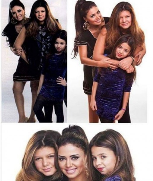 الفنانة المصرية ظهرت في الصور بطريقة صبيانية مع ابنتيها، واتخذن الكثير من الأوضاع المختلفة.