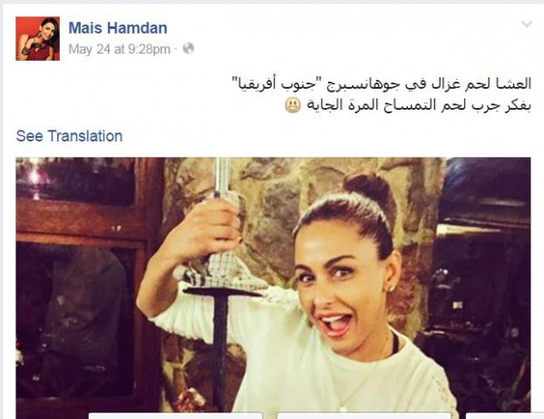 الفنانة ميس حمدان موجودة في مدينة جوهانسبورغ بجنوب أفريقيا، حيث صوّرت حلقة من برنامج المقالب "هاني في الأدغال” مع هاني رمزي، ومن المتوقع عرضه خلال رمضان. إنما اللافت الصورة التي نشرتها حمدان عبر "انستغرام”، تظهرها وهي تتناول اللحم المشوي، قبل أن تعلن إنه لحم غزال، الأمر الذي دفع بعض المدافعين عن حقوق الحيوان إلى مهاجمتها وانتقادها، علماً أنّ لحم الغزال في بعض دول جنوب افريقيا يعتبر من أفخر أنواع اللحوم، نظراً إلى ندرته ومنع اصطياد الغزلان إلا خلال فترة معينة في السنة.