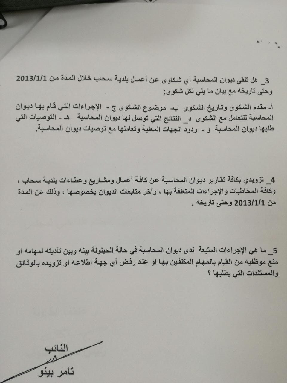 وجه النائب تامر بينو عدد من الأسئلة النيابية الى رئيس الوزراء حول ديوان المحاسبة وزياراته الى بلدية سحاب وموازنات البلدية وكافة اعمالها ومشاريعها وعطاءاتها واخر متابعات الديوان بخصوصها وتاليا نص الأسئلة :