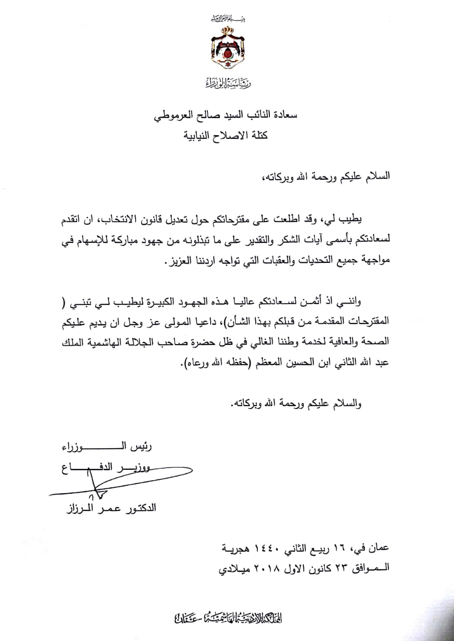 - خاطب رئيس الوزراء الدكتور عمر الرزاز النائب صالح العرموطي (كتلة الإصلاح النيابية) بتبني المقترح المقدم منه والذي قدمته الكتلة لتعديل قانون الانتخابات النيابية.