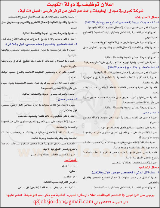 أعلنت شركة في مجال الحلويات والمطاعم عن توافر فرص عمل لديها في الكويت، كما هي تالياً: