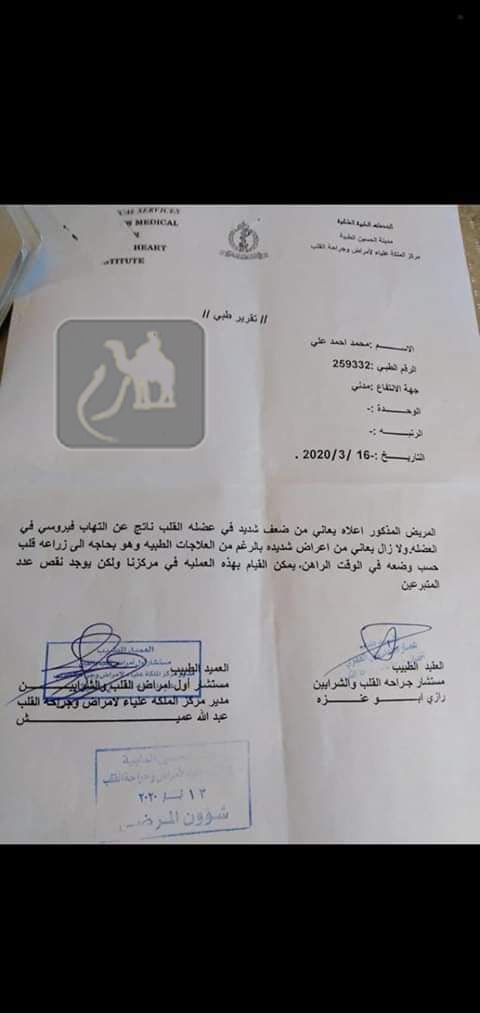 تلقينا نداء إنسانيا من عائلة الشاب محمد أحمد الجبالي البالغ من العمر26 عاما والذي يعاني من ضعف شديد في عضلة القلب وهي تعمل بنسبة 15 % ناتج عن التهاب فيروسي وما يزال يعاني من أعراض شديدة بالرغم من العلاجات الطبية ، وكما أظهرت التقارير الطبية فهو بحاجة إلى زراعة قلب حسب وضعه في الوقت الراهن ، حيث أنه من الناحية الطبية يبقى القلب يعمل بعد الوفاة لساعات ، المشكلة الآن تكمن في نقص عدد المتبرعين داخل الأردن .