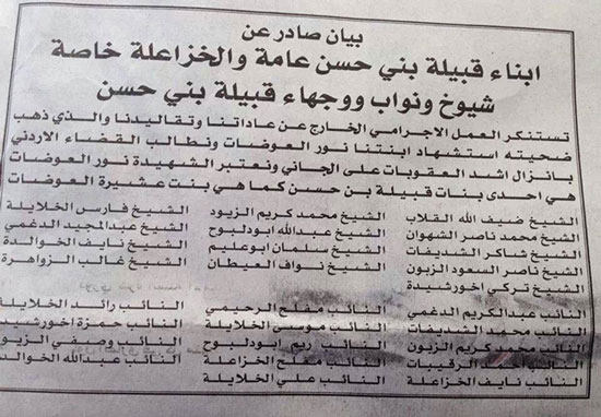 وصدر عن قيادات في قبيلة بني حسن وهي القبيلة الأكبر في الأردن وعن عشائر بئر السبع التي تعتبر في المرتبة الثانية من حيث التعداد السكاني بيان يطالب السلطات بإنفاذ عقوبة الإعدام وفورا بحق شاب ينتمي إلى عشائر بني حسن قتل بدم بارد شابة جامعية في مجمع للحافلات فجرا قبل عدة أيام.