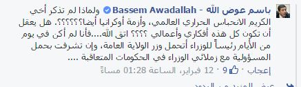 إلى ذلك، تبرأ عوض الله من ضلوعه في تردي الأوضاع الاقتصادي ورد على اتهام بذلك عبر تعليق بالقول 'لم يسبق لي أن تسلمت حكومة'.