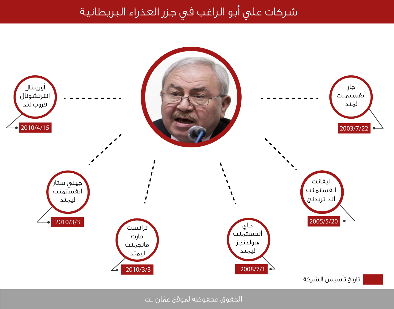 غير أن الوثائق التي بحوزتنا تناقض أقوال أبو الراغب الذي أسس الشركة ( 2 تموز يوليو 2003)، إبان رئاسته للحكومة الأردنية، ويمتلك فيها 45 الأف حصة من أصل 50 ألف،.