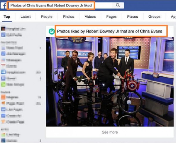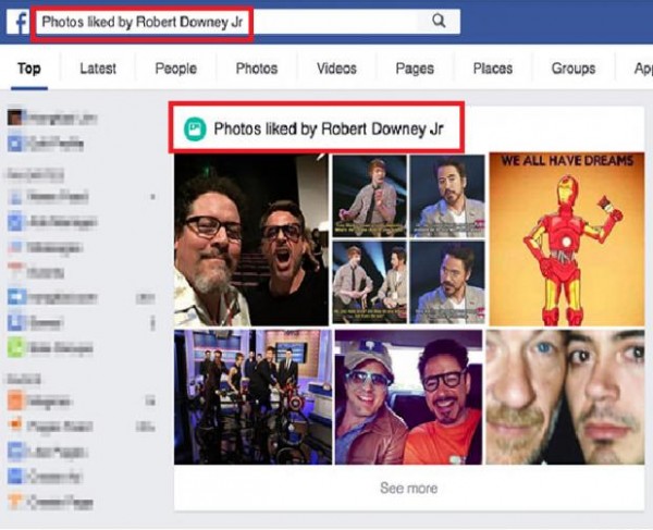 يمكنك أيضا أن تقوم بالبحث عن الصور أو المنشورات التي أعجب بها الشخص الذي تهتم به وتحدد شخص معين آخر في عملية البحث كان قد نشر تلك الأشياء التي أعجب بها من تهتم لأمره، مثال"الصور التي نشرها أحمد وأعجب بها محمد"، فيقوم محرك البحث بحصر الأشياء التي نالت إعجاب أحمد والتي قام بنشرها محمد.