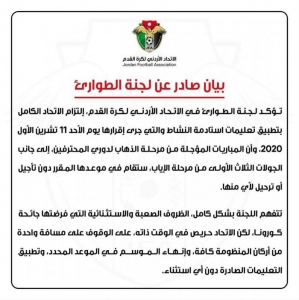ولم يحدد الاتحاد الأردني بشكل واضح وصريح في البيان عن أن مباراة الوحدات والصريح والتي بين بها نادي الوحدات بالأمس أنه قد تم تأجيلها نظراً للظروف الصعبة الذي يمر بها الوحدات، إلا أن الاتحاد وبذكره أنه يقف مع الجميع على مسافة واحدة، يشير إلى أن مباراة الوحدات والصريح قائمة في موعدها إلى غاية اللحظة ودون تأجيل.