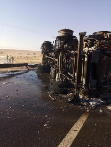 وقالت إدارة السير إن الصهريج محمل بمادة الديزل احترق إثر تدهوره على الطريق الصحراوي قرب مناجم الأبيض.