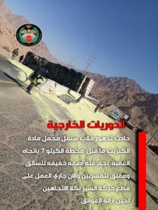 وقالت الإدارة في ادراج لها عبر فيسبوك، إن كوادرها تتعامل مع حادث انقلاب مركبة شحن على طريق العقبة الخلفي ما أدى لإغلاق مسربي الطريق من الجمرك باتجاه عمان بالاتجاهين.