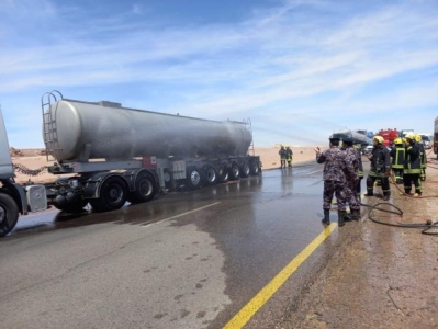 شب حريق، اليوم الاربعاء، بالاطارات الخلفية لصهريج يحمل مادة الفسفوريك على طريق عمان - العقبة، وفق مصدر أمني.