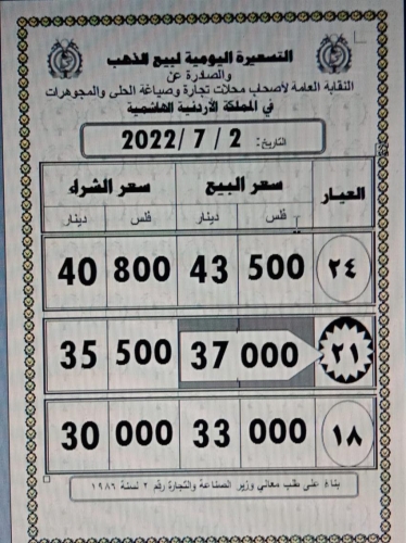 وبلغ سعر الغرام الواحد من الذهب (عيار 21)، 37 دينارا لجهة البيع للزبائن، و35.5 دينار لجهة الشراء من المواطنين.