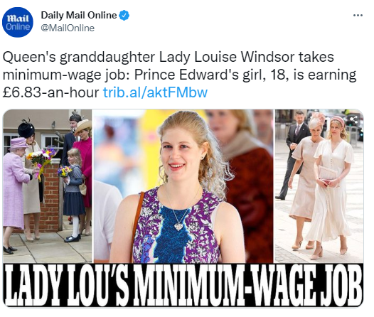 الرأي نيوز - كشف تقرير لصحيفة "ديلى ميل" البريطانية، أن حفيدة الملكة إليزابيث الثانية، لويز وندسور، كانت تعمل عدة أيام في الأسبوع في مركز الحدائق خلال فصل الصيف مقابل الحد الأدنى للأجور، وكانت ابنة الأمير إدوارد وصوفى، كونتيسة ويسيكس، البالغة من العمر 18 عامًا، تكسب 6.63 جنيهًا إسترلينيًا في الساعة منذ الانتهاء من المستويات A فى يونيو، وذلك على الرغم من أنها تعيش في قصر قيمته 30 مليون جنيه إسترليني في باجشوت بارك.