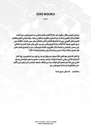 قبل ساعات قام زياد برجي بنشر بيان خاص للرد على الأخبار التي إنتشرت مؤخراً عن تواجده بحفل الموريكس دور لإختياره كأفضل نجم لبناني بدلاً من وائل كفوري الذي إعتذر عن حضور الحفل؛ وهو ما جعل زياد برجي يعلن عن إستيائه من هذه الاخبار ويقرر الرد بشكل علني، رافضاً أن يكون بديلاً لأحد إذ قال في بيان أصدره:"وصلني اليوم مقال يقول أن جائزة افضل فنان لبناني من الموريكس دور كانت للفنان وائل كفوري وإعتذر عن الحضور فقرروا يعطوني إياها مع إحترامي الكبير له إلا أنني أطالب الموريكس دور برد علني على هذا الأمر وتوضيحه ...بإختصار أنا مش بديل لحدا ".