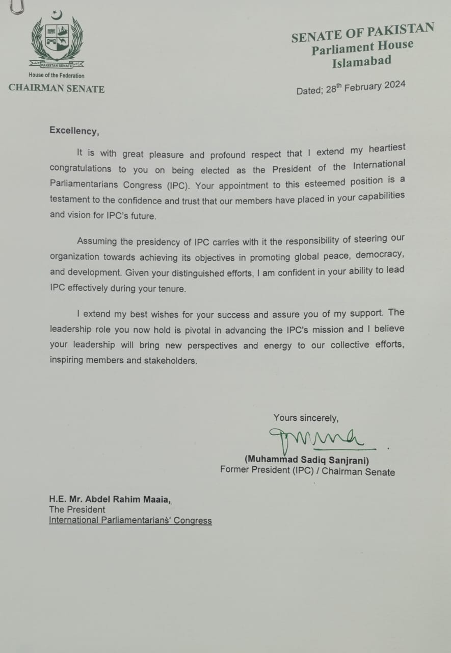 وقال رئيس مجلس البرلمانيين الدولي Ipc السابق محمد صادق سنجراني في رسالة وجهها إلى الأزايدة : إنه لمن دواعي سرورنا البالغ واحترامنا العميق أن نتقدم إليكم بأحر التهاني بمناسبة انتخابكم رئيساً لمجلس البرلماني الدولي IPC.