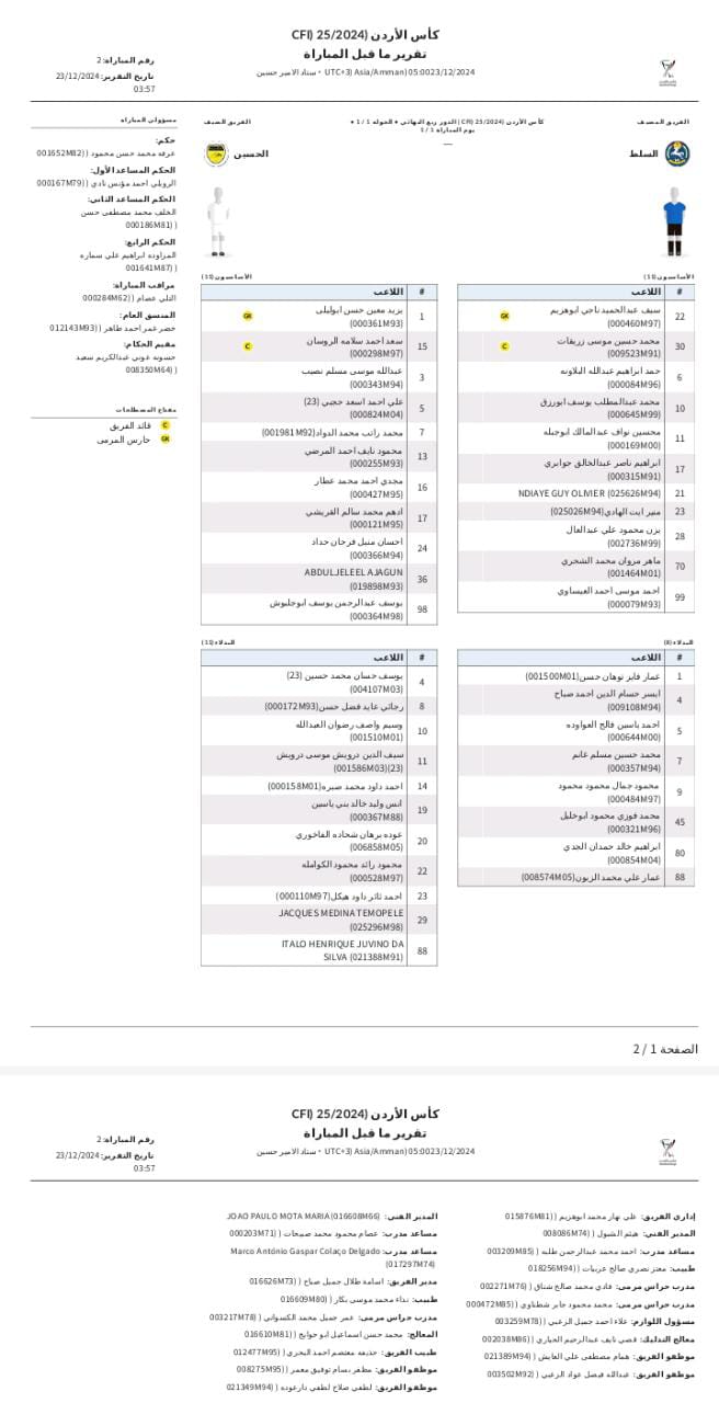 وافتتح مجدي العطار التسجيل للحسين في الدقيقة 13 من عمر اللقاء، قبل أن يعادل أحمد العيساوي للسلط في الدقيقة 60، نتيجة انتهى عليها الوقت الأصلي للقاء.