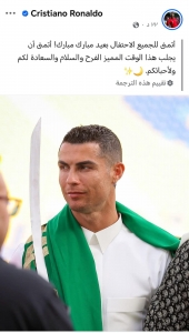 ونشر رونالدو صورة له مرتديًا الزي السعودي عبر حسابه على منصة "إكس”، حيث كتب: "أتمنى للجميع عيدًا مباركًا! عسى أن يحمل هذا العيد المبارك الفرح والسلام والسعادة لكم ولأحبائكم”.