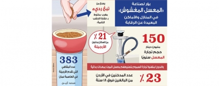 مشاغل تصنيع المعسل تنتشر في العديد من الأحياء، ويمارس صانعو «المعسل المغشوش» أعمالهم في المنازل و الأقبية و المخازن البعيدة عن أعين الرقابة، ليحققوا أرباحا خيالية، حيث تقدر أوساط غير رسمية أن حجم تجارة المعسل في الأردن تتجاوز 150 مليون دينار سنويًا ، في ظل نسبة المواطنين العالية الذين يدخنون الأرجيلة والتي تصل إلى 21 في المئة من السكان، بحسب الجمعية الأردنية لمكافحة التدخين.