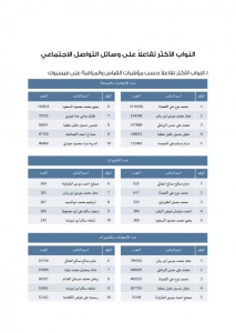 وتبين نتائج المعلومات أن قائمة أكثر النواب متابعة على فيسبوك والتي تضم 10 نواب بلغ عدد متابعيهم 2,096,707 وبنسبة 77,6% من مجموع متابعي 115نائباً يتواجدون على صفحة الفيسبوك، حيث بلغ مجموع عدد المتابعين 2,703,454 .