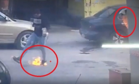 الفيديو يظهر شابين قاما بشراء " بنزين " بعلبة صغيرة ثم توجها إلى السيارة حيث يعتقد ان احدهما كان يدخن " السجائر " ، ويلاحظ ان احد الشابين خرج وقدماه تشتعلان بعد لحظات قصيره من دخوله السيارة ثم قام السائق وهو الشاب الثاني بالفرار بسرعة من المركبة حيث اشتعلت النيران داخلها .