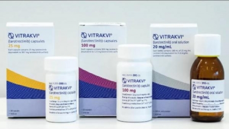 حصل دواء Larotrectinib والمعروف تجارياً بإسم Vitrakvi على موافقة إدارة الغذاء والدواء الأمريكية (FDA) بتاريخ 26/11/2018 يتوفر الدواء بالأشكال الصيدلانية والتراكيز التاليه:-