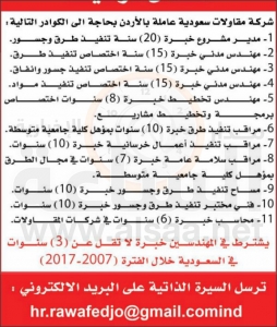 كما أعلنت شركة مقاولات سعودية عاملة بالاردن إلى عدد من الوظائف حسب ما هو مبين تالياً.