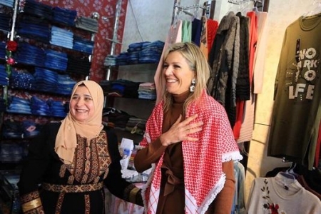 نشرت السفارة الهولنديةفي الأردن، صورا للملكة ماكسيما، خلال جولتها في شوارع الأردن، مرتدية الشماغ على كتفيها.