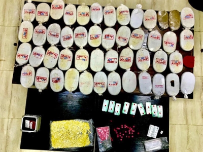 وأضاف الناطق الإعلامي أنه وبعد التحقيق والمتابعة تم تحديد هوية ثلاثة أشخاص ومكان تواجدهم واخفائهم لكميات من المواد المخدرة داخل أحد المنازل جنوب العاصمة ، حيث جرت مداهمته والقي القبض على اثنين منهم فيما لاذ الثالث بالفرار وما زال البحث جارياً عنه ، وبتفتيش المنزل تم ضبط ٥٠ كفاً من مادة الحشيش و ٤٠٠٠ حبة كبتاجون مخدرة وكميات كبيرة من حبوب الترامادول المخدرة.