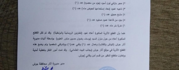 وقال الناطق الإعلامي بإسم مديرية الأمن العام أن معلومات وردت للعاملين في فرع أمن وقائي محافظة جرش بوجود مجموعة من القطع الأثرية التي تعود لآثار جرش التاريخية داخل حديقة أحد المنازل في منطقة الشيخ مصلح حيث بوشر بتتبع تلك المعلومات لضبط تلك القطع الأثرية والقاء القبض على المتورط بإخفائها.