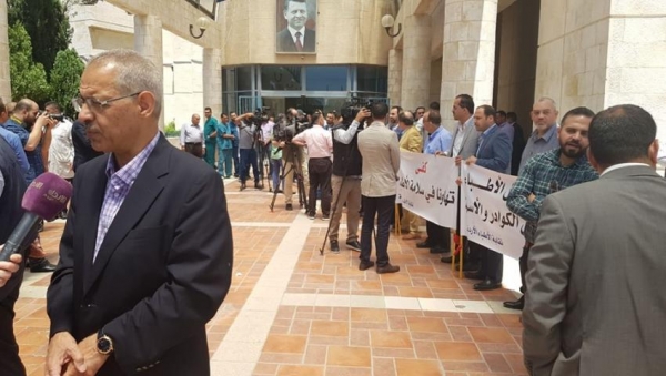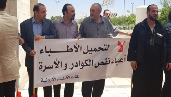 نفذ الأطباء، ظھر الیوم الأحد، وقفة احتجاجیة أمام البوابة الرئیسیة لمستشفى الأمیر حمزة في عمان رفضاً للاعتداءات المتكررة علیھم وآخرھا ضرب الدكتورة روان سامي الجراحة المقیمة في المستشفى قبل أیام.