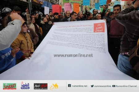 وظهرت يافطات وعرائض تتحدث عن غاز الاحتلال وضرورة اسقاط إتفاقية الغاز مع اسرائيل.