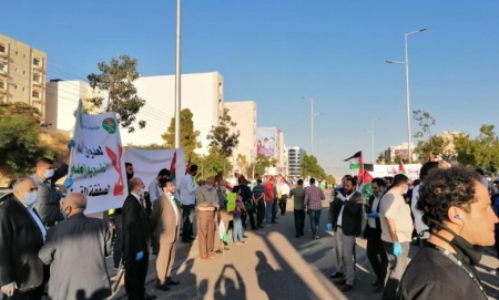 وحمل المشاركون لافتات حملت شعارات الرفض والاستنكار لهذا القرار العنجهي، ومؤكدين وقوفهم خلف القيادة الهاشمية، وما يمر به الأردن من تحديات تتطلب توحيد الصف الوطني الأردني والفلسطيني في مواجه هذه المخاطر.