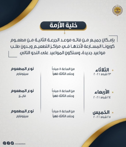 دعت خلية الأزمة الاثنين، المواطنين الذين فاتهم موعد تلقي الجرعة الثانية من مطعوم كورونا، المسارعة لأخذها في مراكز التطعيم، دون طلب مواعيد جديدة، وتاليا البرنامج الزمني لمواعيد تلقي المطعوم.