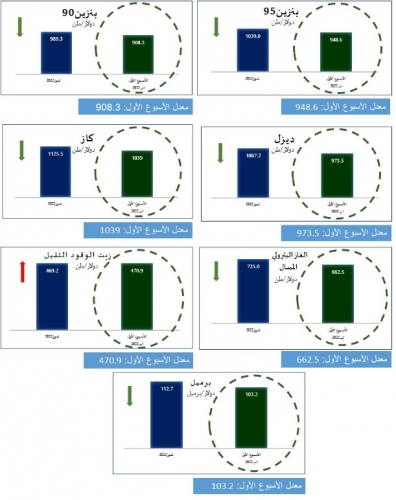 وانخفض سعر الديزل من 1087.2 دولار للطن إلى 973.5 دولار وبنسبة انخفاض بلغت 7.7%.