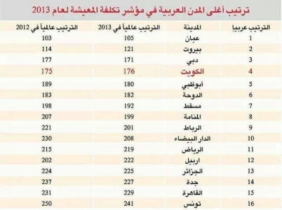 الراي نيوز- أظهر مؤشر تكلفة المعيشة لعام 2013 أن عمان أغلى المدن العربية، وتأتي العاصمة اللبنانية بيروت بالمرتبة الثانية ومن ثم دبي والكويت على التوالي، وتونس العاصمة في آخر القائمة.