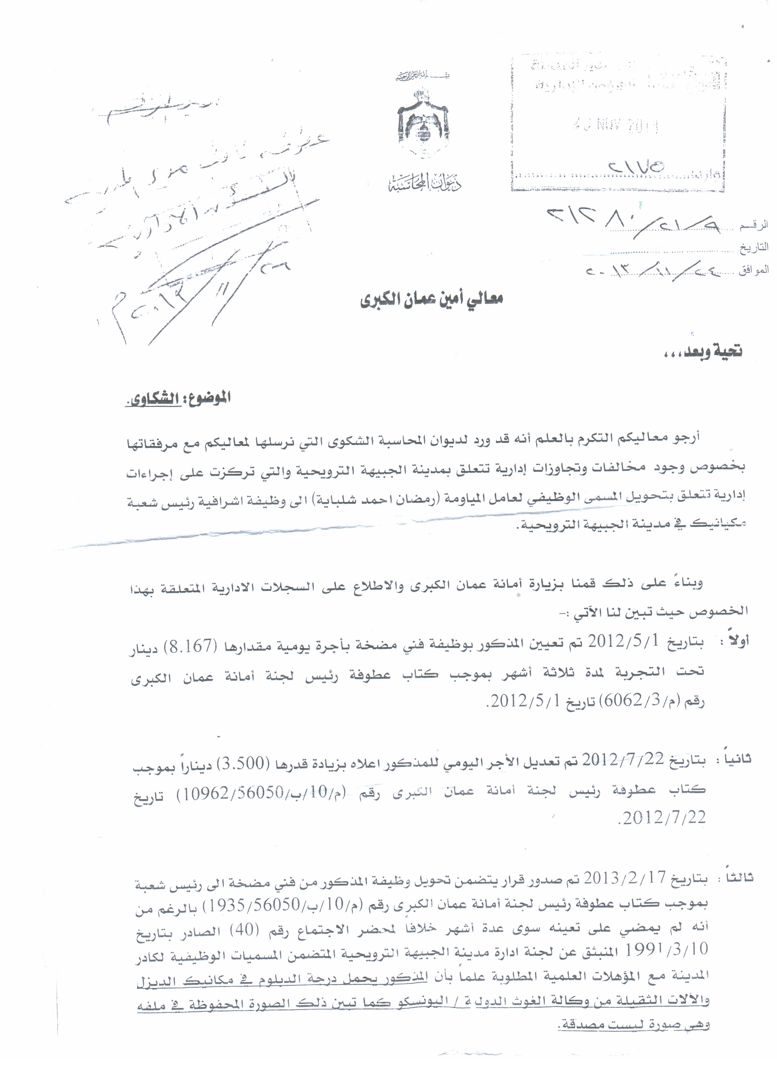وفي الكتاب الموجه من ديوان المحاسبة الى امين عمان فقد جرى تحويل عامل المياومة رمضان احمد شلباية الى وظيفة اشرافية 'رئيس شعبة الميكانيك في مدينة الجبيهة حيث تم تعيين الموظف المذكور مدة 3أشهر بأجرة يومية لمدة 3 أشهر ثم جرت زيادة أجرته بواقع ثلاثة دنانير ونصف لعدة أشهر الا ان صدر قرار بتحويله إلى رئيس شعبة بموجب كتاب صادر عن رئيس لجنة أمانة بالرغم من مرور عدة أشهر على تعيينه وهو يحمل دبلوم في الميكانيك بصورة ليست مصدقة والوثيقة المرفقة توضح ذلك.
