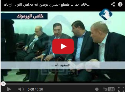 بثت قناة اليرموك الفضائية مساء الإثنين تصويرا لرئيس مجلس النواب الاردني عاطف الطراونة يعلن عزم المجلس تأجيل التصويت على طرح الثقة عن الحكومة في حال عدم استجابتها لمطلب مجلس النواب بطرد السفير الاسرائيلي من عمان بعد استشهاد القاضي الاردني رائد زعيتر الاسبوع الماضي على يد جنود الاحتلال .
