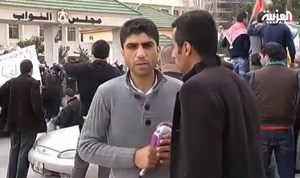 : تعرض مراسل قناة العربية في الاردن غسان ابو اللوز لموقف محرج عندما اعترضه متظاهر اردني وطالبه بنقل الاخبار كافة على حقيقتها ودون اي تحيز.