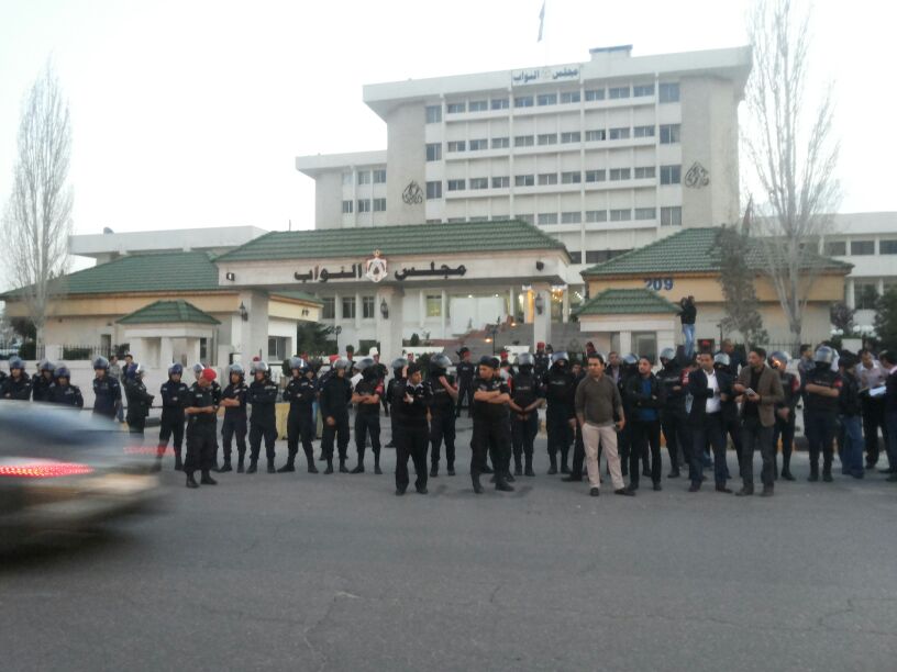 وكان المعتصمون بدأوا فعاليهم أمام مجلس النواب، بعد تعذر وصولهم إلى 'الداخلية' نتيجة التشديدات الأمنية الكبيرة، قبل أن يتجهوا إلى طرق فرعية أوصلتهم إلى دوار فراس في جبل الحسين.