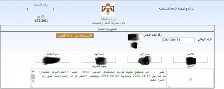 يذكر أن مجلس الوزراء قرر الموافقة على صرف الدعم هذا العام للأسر الأردنية التي يقل مجموع دخل أفرادها خلال العام الماضي 2013 عن عشرة آلاف دينار، ولا يمتلك أفرادها أكثر من 3 مركبات، ولا يمتلك أفرادها ثروة صافية حسب القيمة التخمينية للأراضي والعقارات وحصص وأسهم في الشركات، بالإضافة إلى أرصدة بنكية تزيد قيمتها على 250 ألف دينار.