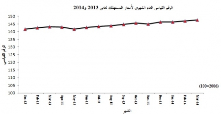 وأشار التقرير إلى أن متوسط أسعار المستهلك قد ارتفع بمعدل 3.1% لشهر آذار 2014 مقارنة بنفس الشهر من عام 2013. ومن أبرز المجموعات السلعية التي ساهمت في هذا الارتفاع كل من مجموعة "الإيجارات" بنسبة 7.7%، ومجموعة "التبغ والسجائر" بنسبة 15.2%، ومجموعة "التعليم" بنسبة 5.6%، ومجموعة "الملابس والأحذية" بنسبة 7.6%، ومجموعة "الفواكه" بنسبة 7.6%. في حين كان من أبرز المجموعات السلعية التي انخفضت أسعارها مجموعة "الوقود والانارة" بنسبة (1.3%)، ومجموعة "العناية الشخصية" بنسبة (2.2%)، ومجموعة "الزيوت والدهون" بنسبة (1.4%)، ومجموعة "الثقافة والترفيه" بنسبة (0.7%).